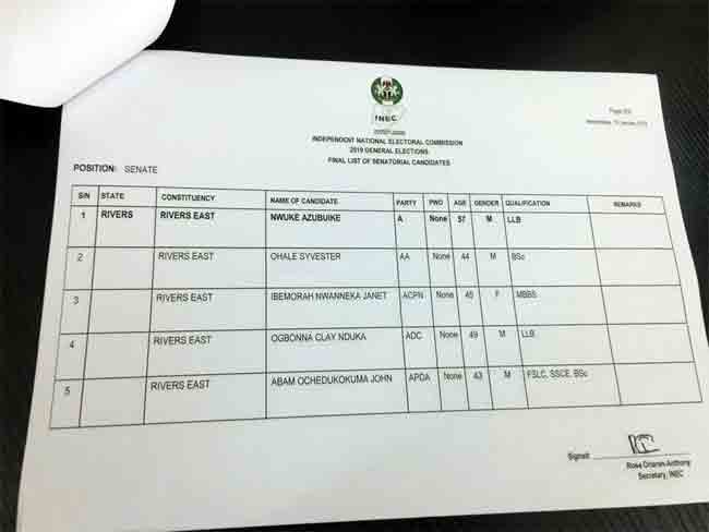 - The Independent National Electoral Commission (INEC) has released the names of candidates for the National Assembly election in Rivers State.
