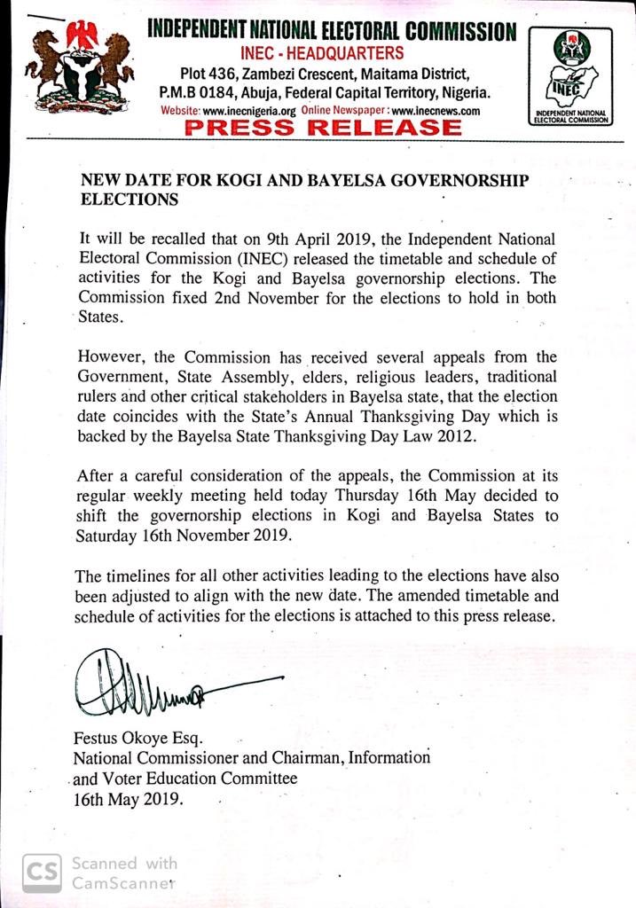 Breaking NewsNationalPoliticsBreaking News: INEC Shifts Kogi, Bayelsa Governorship Elections Last updated: May 16, 2019 4:38 pm gbaramatuvoice Share 0 Min Read SHARE MOVING ON TO THE BIGGER PLAYING FIELD BY DR. EMMANUEL UDUAGHAN Jonathan, Obasanjo sit side-by-side in church Wike, Dickson fight dirty over oil well, Ijaw traditional stool ‘How can one man marry over 6 wives and still have his brain intact?’ – Wike fires back at Ned Nwoko $9 billion worth of gold is illegally taken out of Nigeria annually through private jets – Femi FalanaSign Up For Daily NewsletterBe keep up! Get the latest breaking news delivered straight to your inbox.By signing up, you agree to our Terms of Use and acknowledge the data practices in our Privacy Policy. You may unsubscribe at any time. Share This Article Facebook Copy Link Print Share Previous Article Sarabubowei Community warns against sidelining her over clean-up Next Article Gunmen kidnap 5 oil workers in Rivers Stay Connected235.3kFollowersLike69.1kFollowersFollow11.6kFollowersPin56.4kFollowersFollow136kSubscribersSubscribe4.4kFollowersFollow - Advertisement -Latest News Nigerian Army to Recruit 24,000 Soldiers Amid Rising Security Challenges News November 19, 2025 National Security at Risk: Buratai Condemns Wike’s Public Attack on Military Officer News November 11, 2025 IYC to INEC Chairman: Suspend Voter Registration in Warri Federal Until Ward Delineation Is Gazetted Current News Latest News October 30, 2025 DIRI vs EWHRUDJAKPO: Court Stops Moves to Impeach Bayelsa Deputy Governor Latest News October 30, 2025