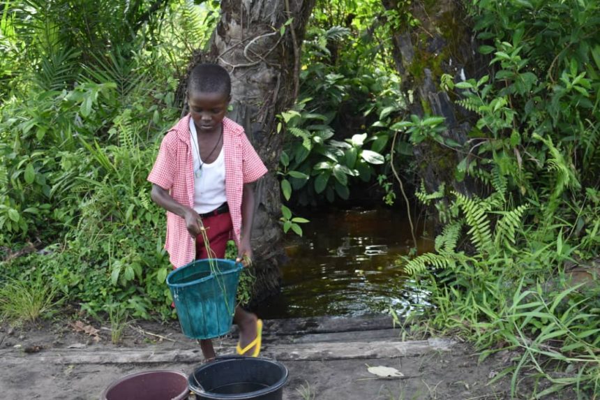 A pupil of Kokodiagbene primary school spotted fetching water from the community well, the only source of drinking water for the community. (Photo by Godbless Motiola, GbaramatuVoice).