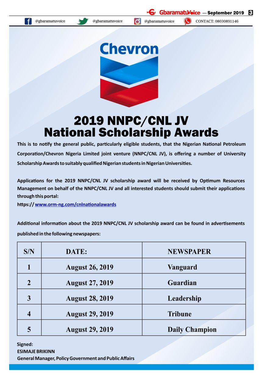 Additional information about the 2019 NNPC/CNL JV scholarship award can be found in advertisements published in the following newspapers: