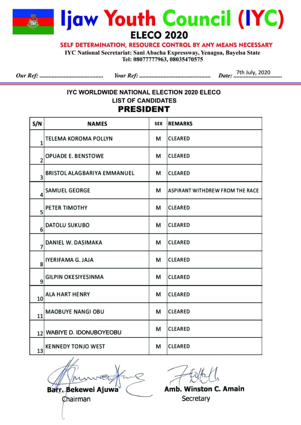 - The list signed by the IYC Eleco Chairman, Barr. Bekewei Ajuwa and Secretary, Amb. Winston Amain, released the list to GbaramatuVoice on Tuesday.