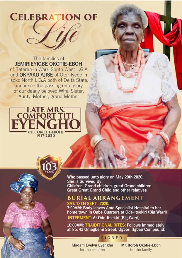 “With gratitude to Almighty God for a life well spent, the families of Jemirieyigbe Okotie-Eboh Warri South-West and Okpako Ajise of Otor-Iyede in Isoko North LGA both of Delta State, hereby announce the funeral rites of our late dear mother, Mrs Comfort Titi Eyengho (Okotie-Eboh), who passed unto eternal glory on May 29, 2020 at the age of 103,” the statement said.