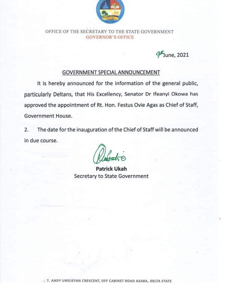 The letter reads: “It is hereby announced for the information of the general public, particularly Deltans that His Excellency, Senator Dr. Ifeanyi Okowa has approved the appointment of Rt. Hon. Festus Ovie Agas as Chief of Staff, Government House.