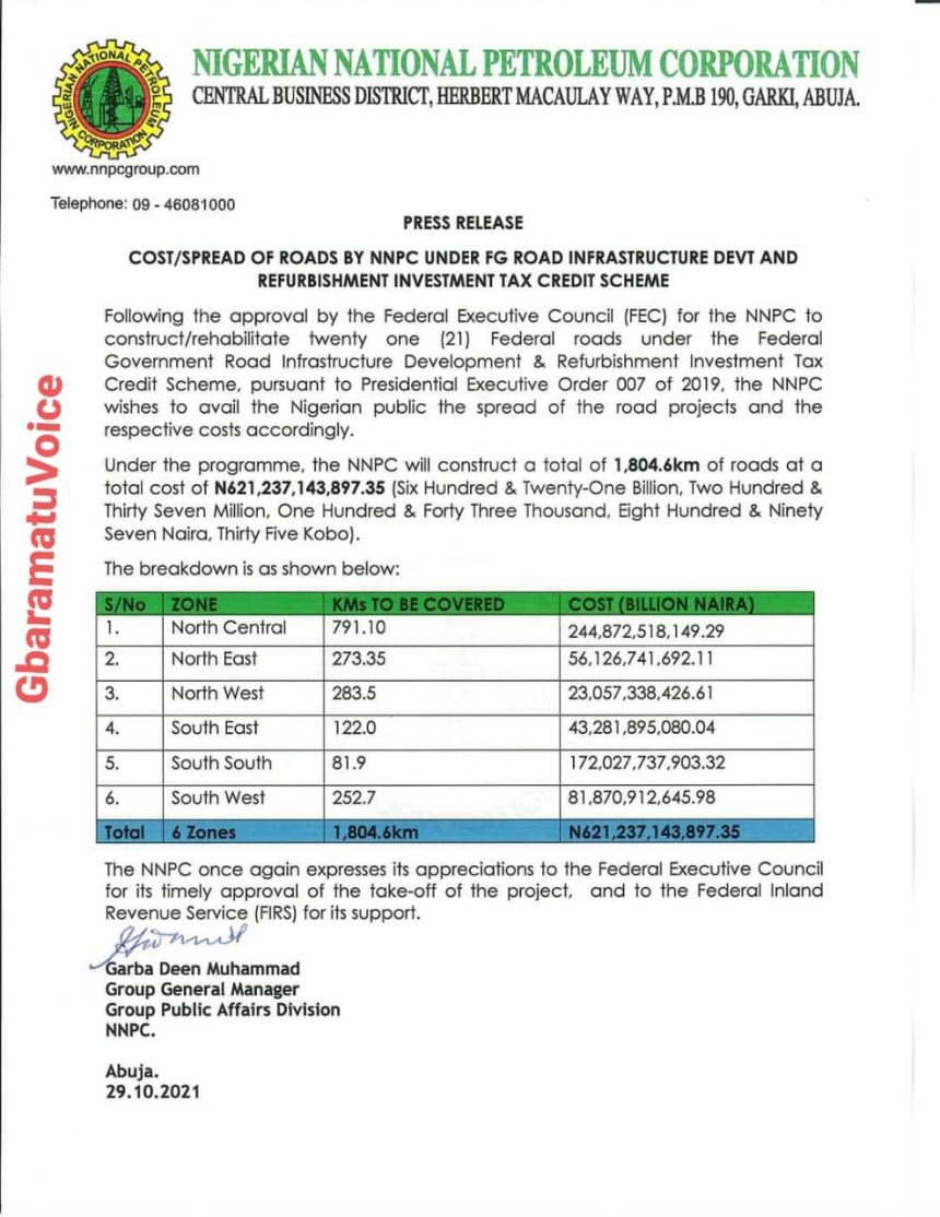 The Nigerian National Petroleum Corporation (NNPC) on Friday released a detailed breakdown of how it planned to spend the N621.2billion tax liabilities on federal roads in the country.