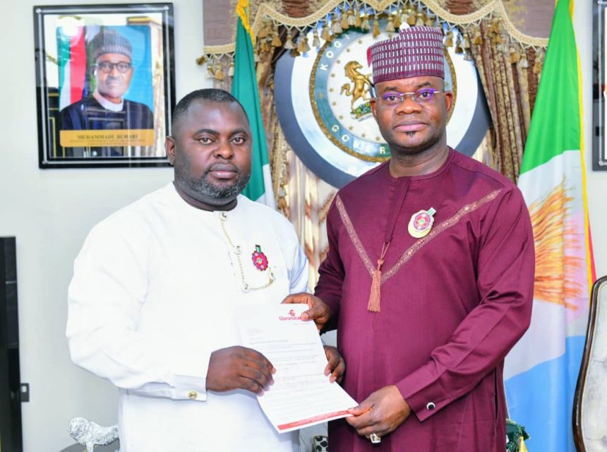 The Publisher/CEO of GbaramatuVoice Media Group, Jacob Abai presenting official letter of the tour to the Executive Governor of Kogi State, Alhaji Yahaya Bello.