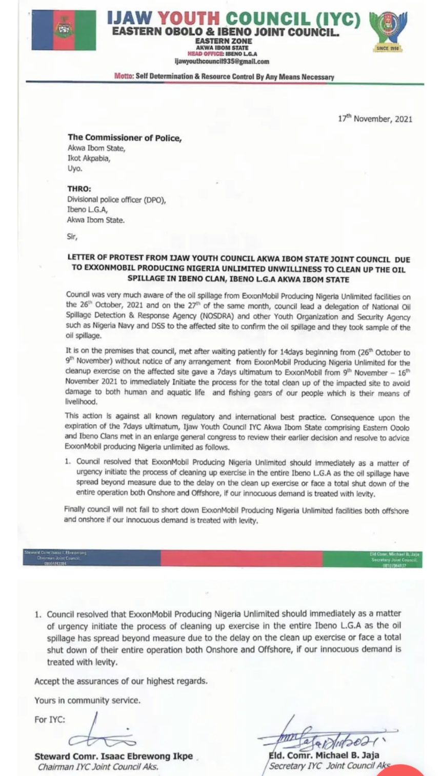 He however called on Exxon Mobil to engage the people and build confidence whilst thanking the IYC Clans of Eastern Obolo and Ibeno for their peaceful disposition in the protest.
