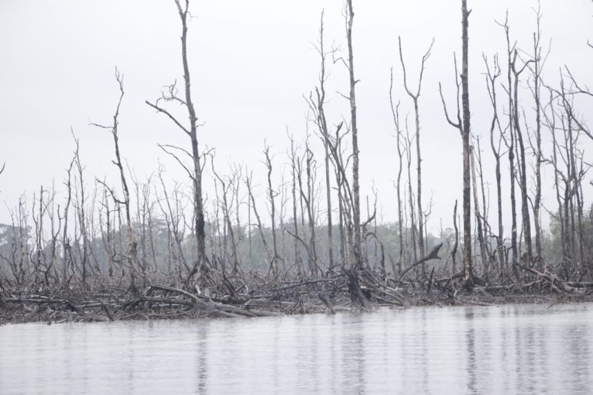 In the Niger Delta, the once greener mangrove forests are dying, gas flare dry their leaves, the trees fallen from the daily activities, photosynthesis contaminated, the soil devastated by crude, the river aquatic lives become lifeless, when all these trees die before our eyes, human too is not safe.