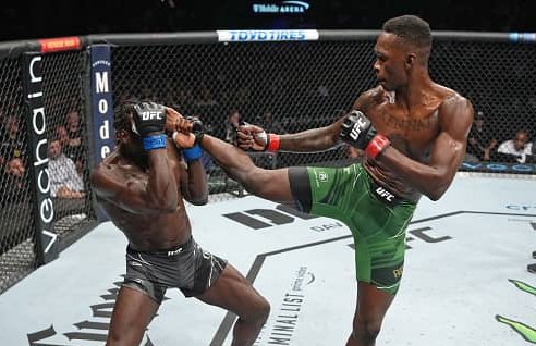 UFC middleweight champion Israel Adesanya and Jared Cannonier both threw leg kicks in round one without a touch of gloves.