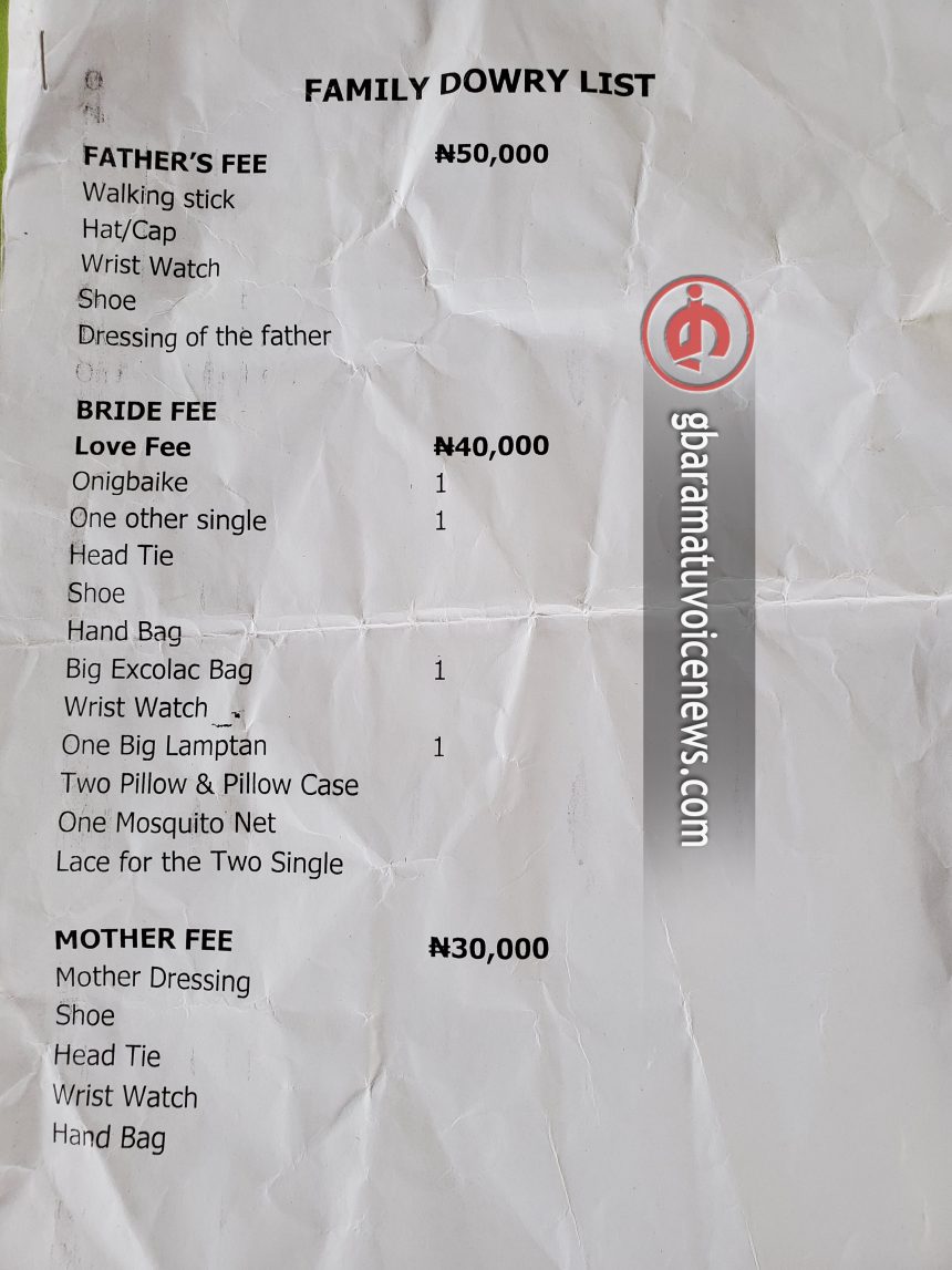 NOTE: This traditional marriage list is from Akparegbene community, Ayakoromo in Ngbelebiri kingdom, Burutu Local Government Area of Delta state.