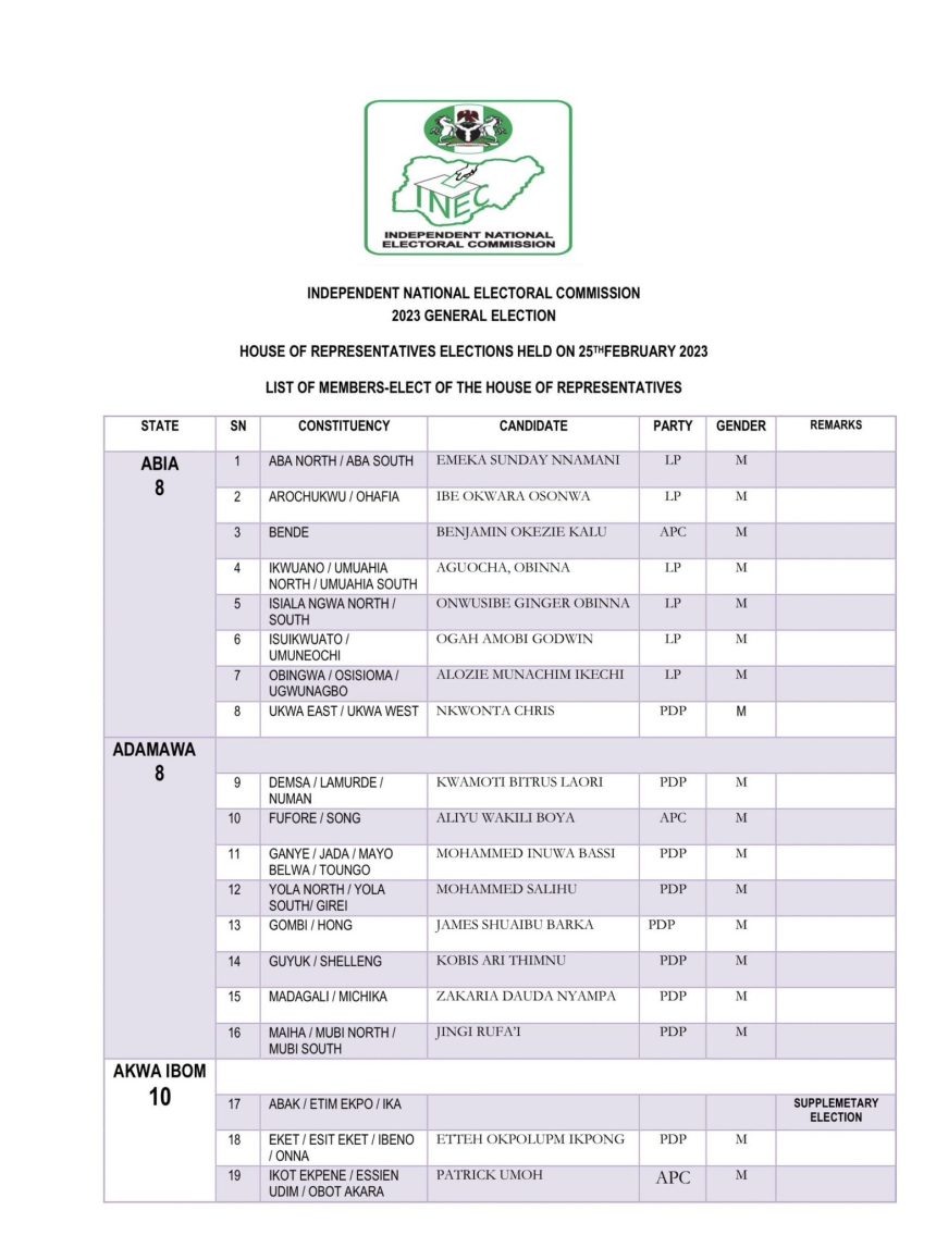 The Independent National Electoral Commission (INEC) has released the full list of members-elect of the 10th House of Representatives.