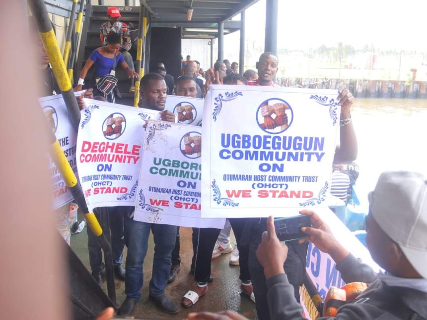 The protesters, who also engaged the services of a disc jockey to provide additional vibes inside the houseboat, were armed with placards and banners indicating some of their demands, the top of which is the recognition and inclusion of Otumara Host Community Development Trust in the implementation of the Petroleum Industry Act (PIA).