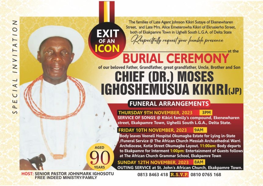 In a heartfelt invitation signed by the clergyman, Pastor John Mark Ighosotu, the Kikiri family of Ekakamre town in Ughelli South L.G.A, Delta State, warmly welcomes the public. They extend a cordial invitation to the public to join them in commemorating the life and legacy of their beloved Father, Grandfather, Great-Grandfather, Uncle, Brother, and Son, Chief (Dr.) Moses Ighoshemusus Kikiri (JP).