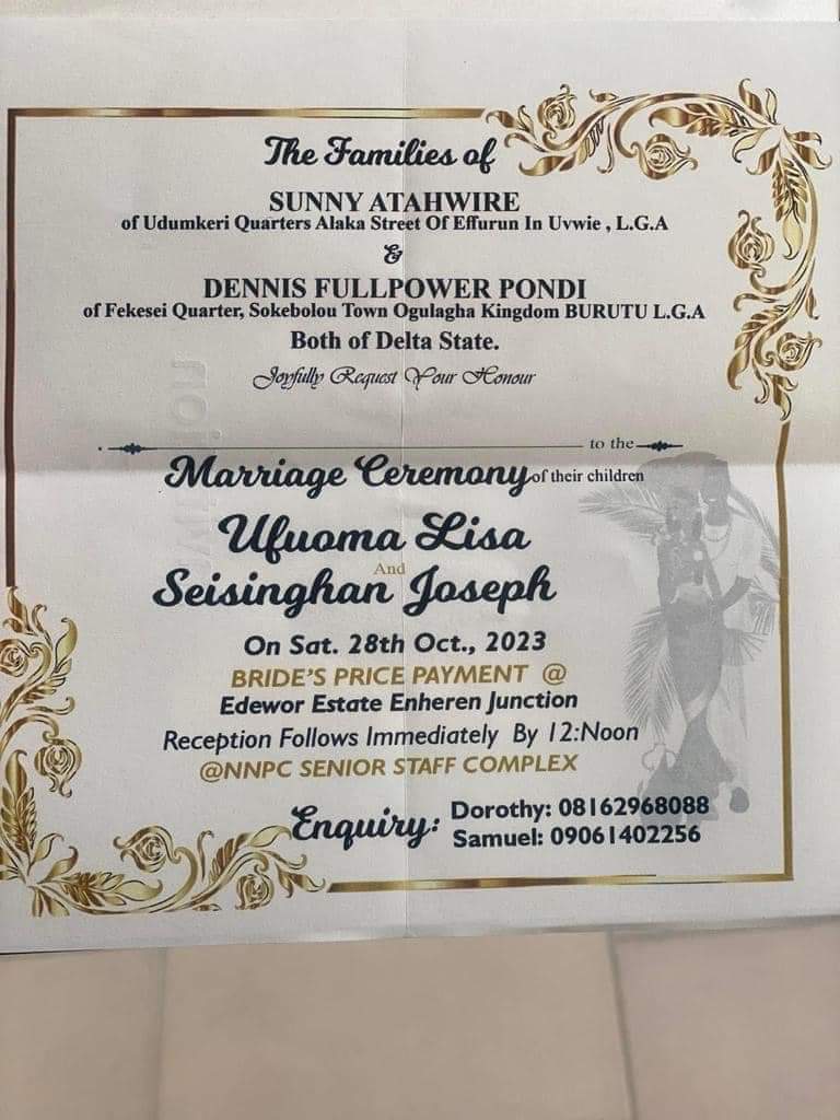 This grand celebration is scheduled for Saturday, October 28, 2023, at the NNPC Senior Staff Complex in Effurun. It promises to be a union not only of two hearts but also of two rich and diverse cultural heritages.