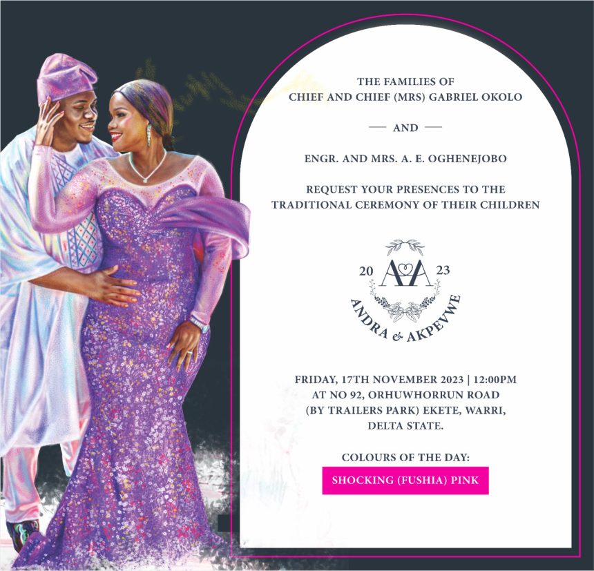 The much-anticipated wedding of Akpevwe, an accomplished Engineer and PhD student, from the Oghenejobo family of Samagidi in Ethiope East LGA, Delta State, will be joined by Andra, a university graduate, in this joyous occasion.