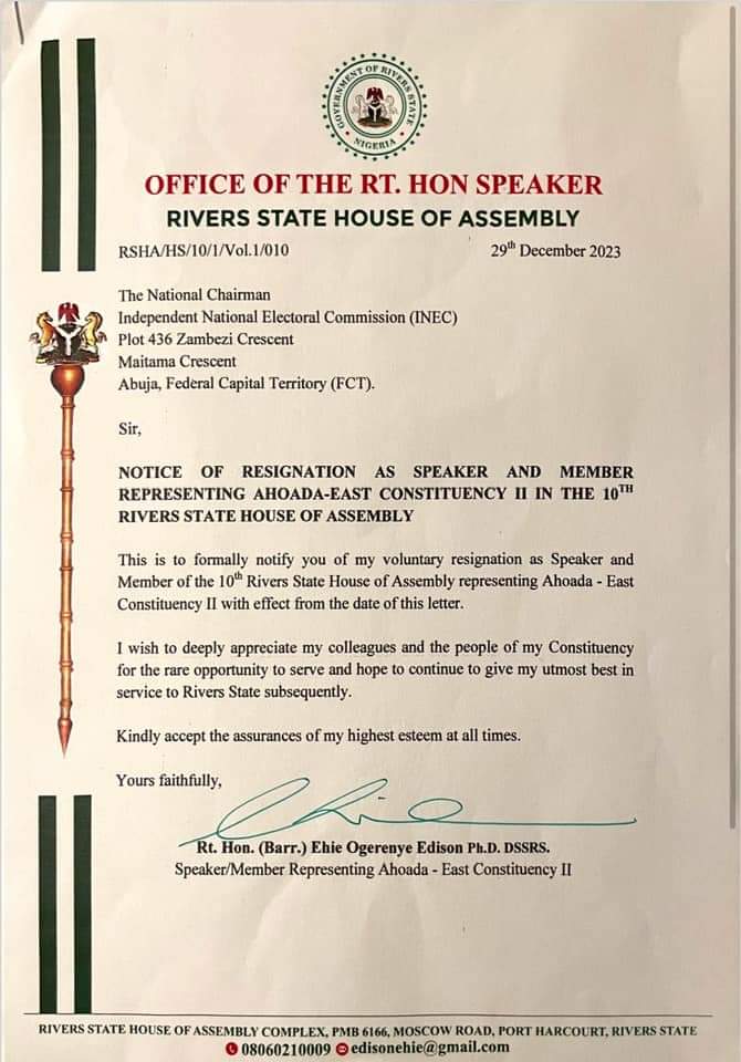 Rt Hon Edison Ehie has resigned as a member representing Ahoada East in the Rivers State House of Assembly and also the speaker of a group of lawmakers.