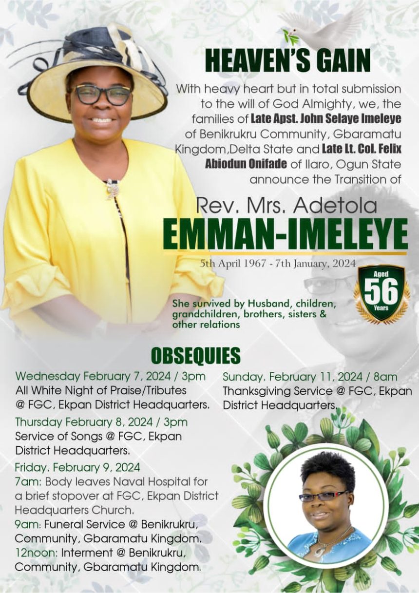 We extend our deepest condolences to you and your family on the passing of your beloved wife, Rev. Mrs. Adetola Emman-Imeleye. Her sudden departure has left us all in shock and disbelief. Just on January 4th, she graced us with her powerful message at our corporate thanksgiving, leaving an indelible mark on our hearts and minds.