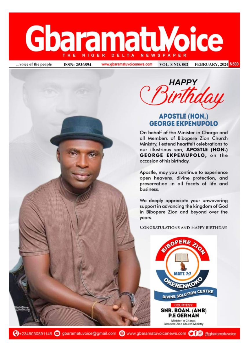 Bibopere Zion Church Ministry in Okerenkoko town has celebrated the birthday of their esteemed son, Apostle (Hon.) George Ekpemupolo. Led by the Minister in Charge, Snr. Boan. (Amb.) P.E. German, and joined by all members of the ministry, heartfelt celebrations were extended to Ekpemupolo on this special occasion.