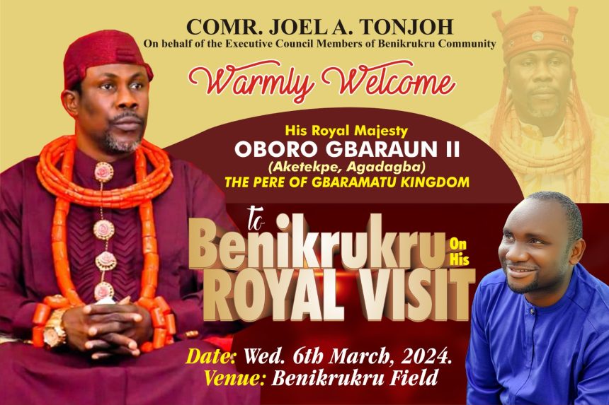 His Royal Majesty, Oboro-Gbaraun II, Aketekpe, Agadagba, the Pere of Gbaramatu Kingdom in Delta State, is scheduled for a momentous visit to Benikrukru Community. The Pere, belonging to the Oboro ruling house in Benikrukru town, where he was selected, will undertake this journey to his ancestral roots on Wednesday, March 6, 2024.