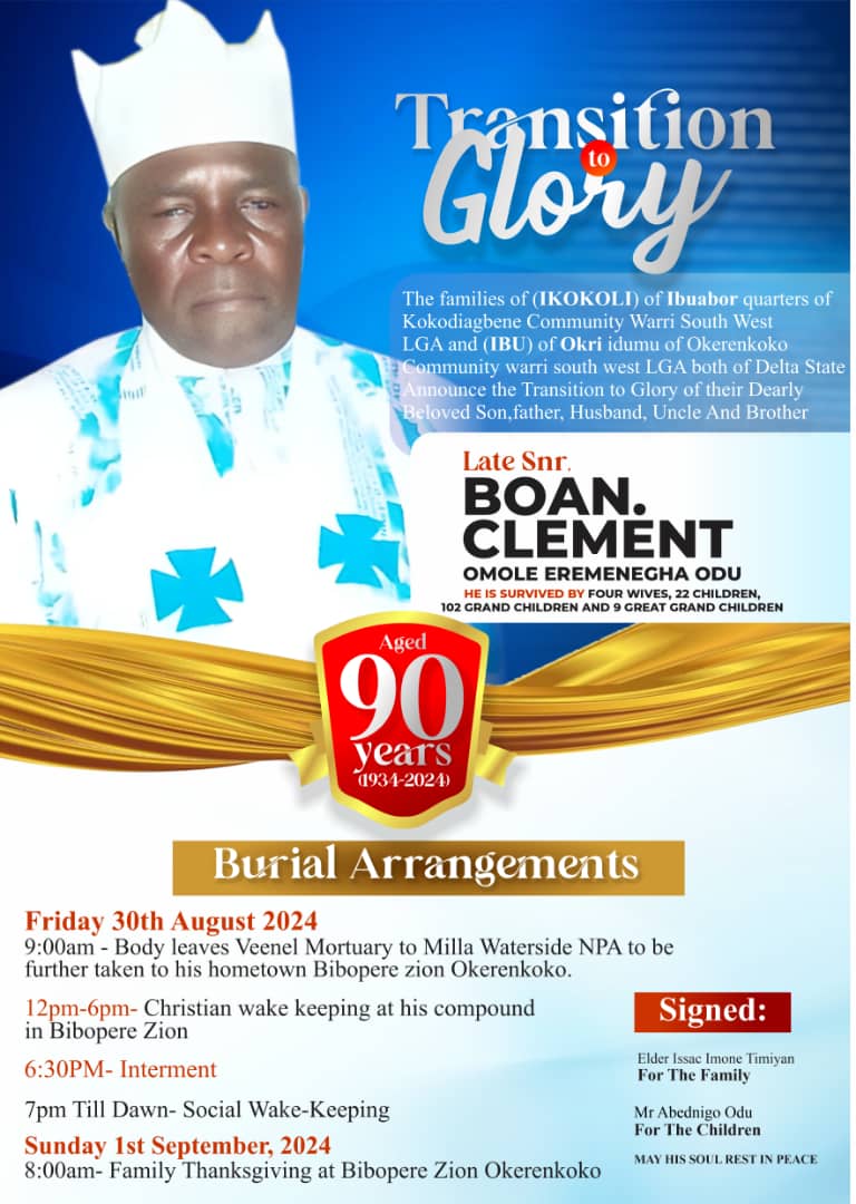Gbaramatu Kingdom is set to bid a final farewell to Elder Clement Omole Eremengha Odu, who passed away at the age of 90. The burial rites are scheduled for Friday, August 30, 2024, and will take place in his hometown of Bibopere Zion, Okerenkoko, Warri South West Local Government Area of Delta State.