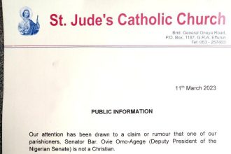 Delta 2023: Respect sacred lines, Warri Catholic Diocese urges politicians ...Says Omo-Agege…